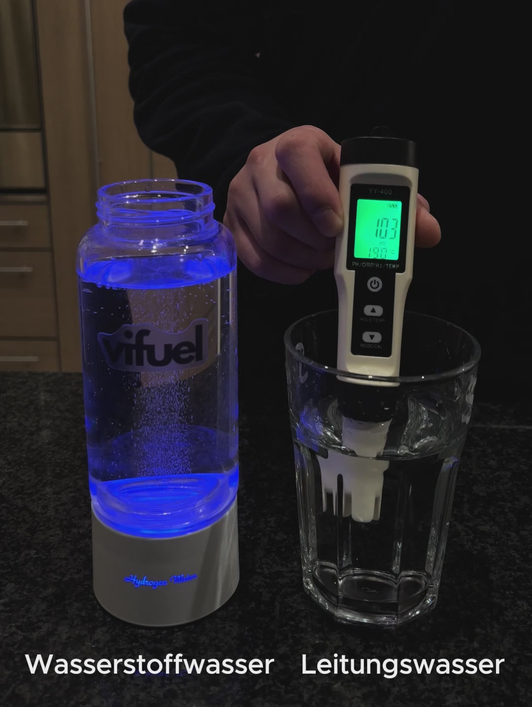 Im obrigem Video ist der Vergleich zwischen schweizerischem Leitungswasser und frisch generiertem Wasserstoffwasser zu sehen.
