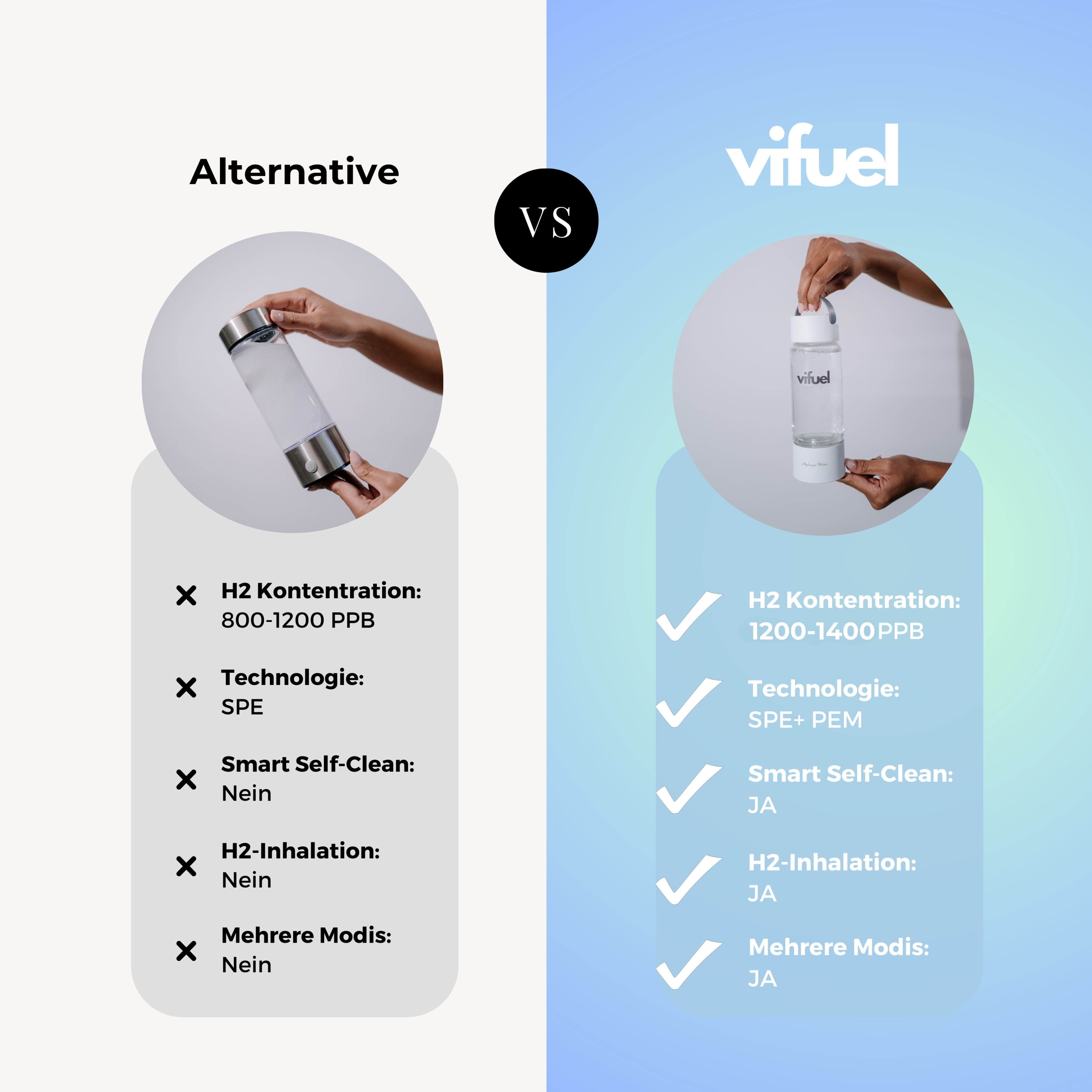 Obwohl normales Wasser (H₂O) bereits Wasserstoff enthält, ist dieser chemisch gebunden und kann nicht dieselben gesundheitlichen Vorteile bieten wie molekularer Wasserstoff (H₂) in freier Form. Die Vifuel Wasserflasche reichert das Wasser mit freiem molekularem Wasserstoff an, der als starkes Antioxidans wirkt und nachweislich entzündungshemmende Eigenschaften hat, die Zellgesundheit fördert und die Regeneration nach körperlicher Anstrengung unterstützt. Diese freien Wasserstoffmoleküle können leichter von den Zellen aufgenommen werden und bieten so therapeutische Vorteile, die gebundener Wasserstoff nicht bieten kann.